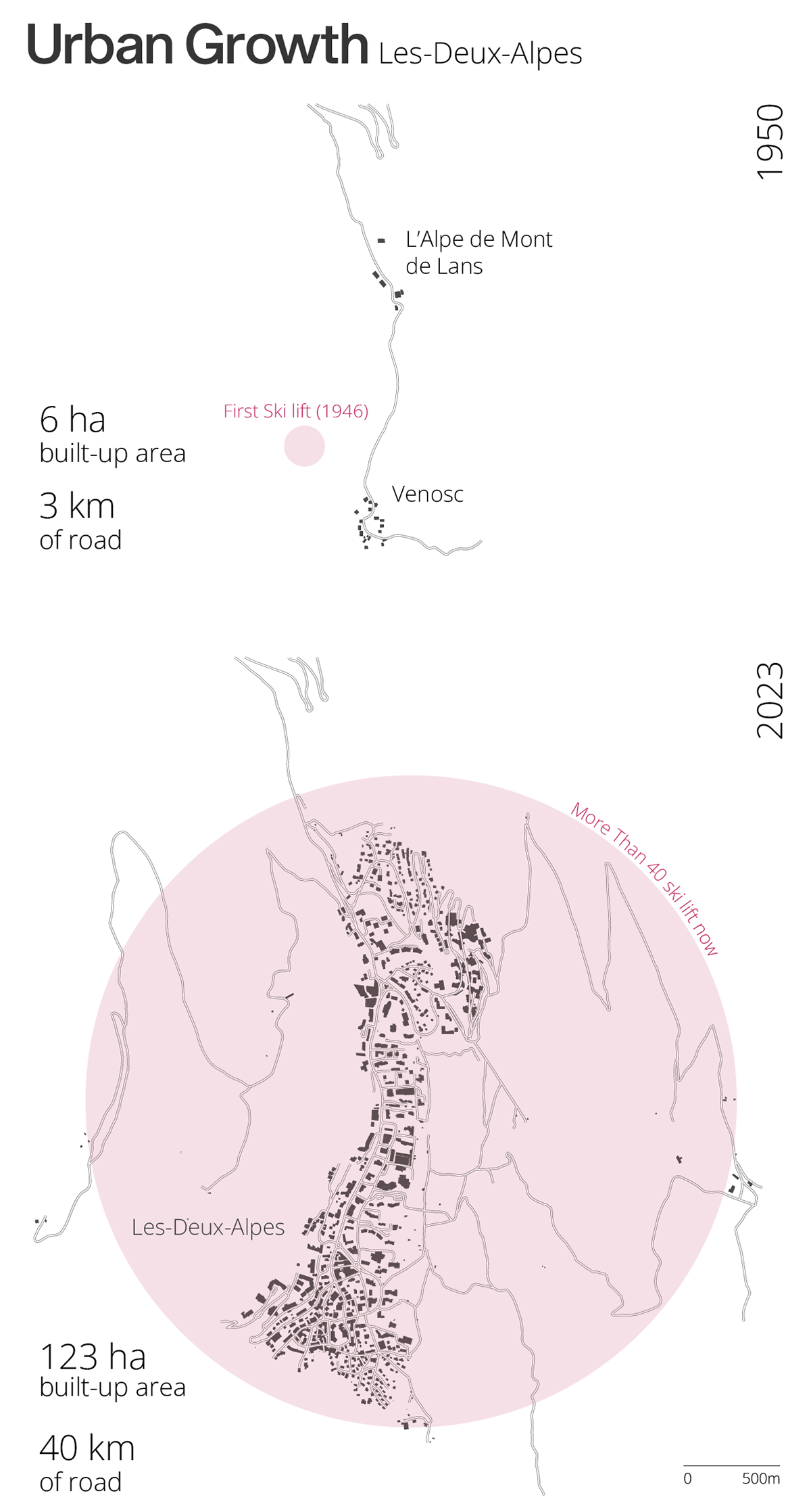Je propose ici une visualisation de l’évolution de l’étalement urbain sur le territoire de montagne des Deux-Alpes au cours des 70 dernières années.