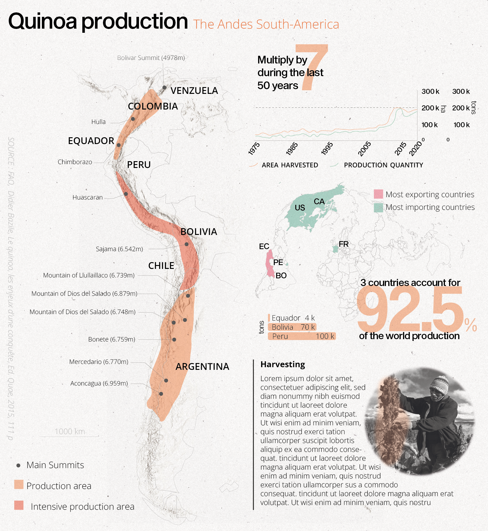 Réalisé dans le cadre d’un projet de Master 2, cette carte illustre les zones de culture du quinoa en Amérique du Sud, le territoire de production majeur à l’échelle mondiale.