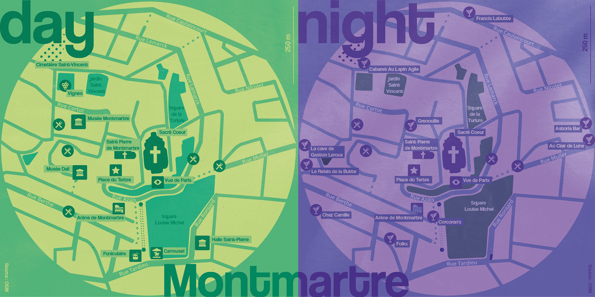 Cette carte à vocation touristique a pour objectif de mettre en valeur les différents lieux d'intérêt autour du Sacré-Cœur, de jour comme de nuit.